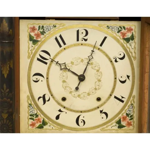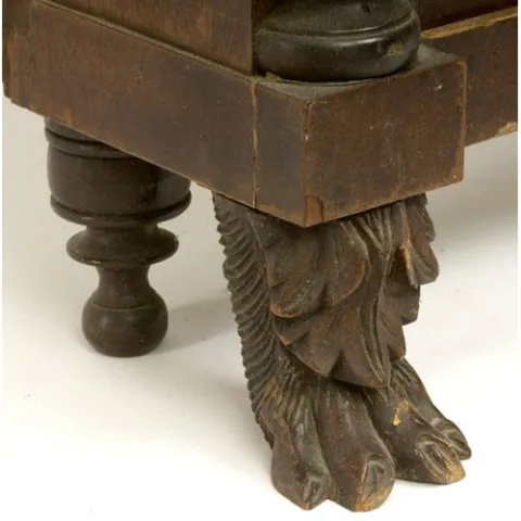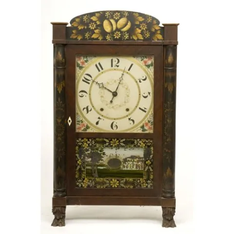 in mahogany, with paw feet, and bearing its original paper label, its original reverse-painted tablet, and original surface with gold-stenciled decor...