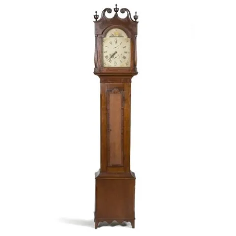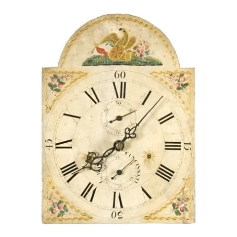 Cincinnati Tall Case Clock, ca 1816-1825, in cherry and mahogany with poplar secondary wood. The hood has four columns and a broken-arch pediment tha...