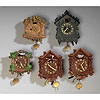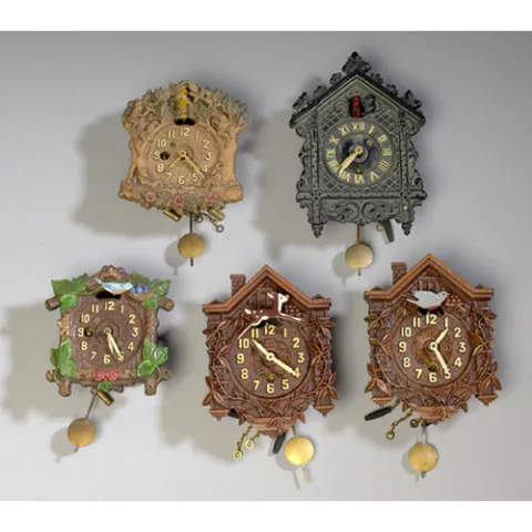 each a different wall-mounted Cuckoo style, three with birds, one with a deer and one with a woodcutter, with weights and pendulums; each approximate...