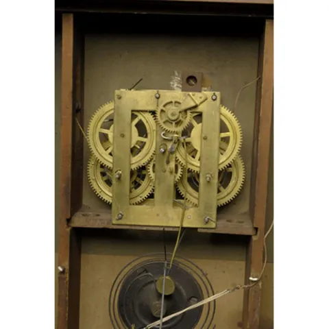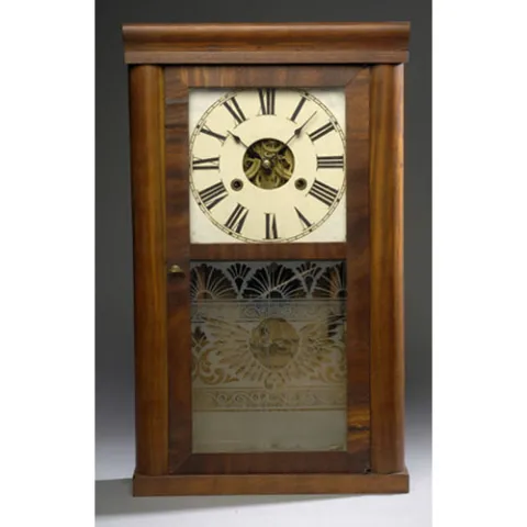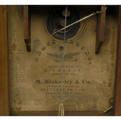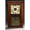 with painted tin dial with Roman numerals, open escapement, 8-day time and strike brass weight driven works, interior printed paper label as above an...