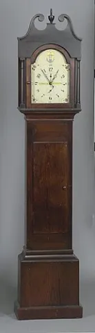 all pine. The hood has a tombstone door, broken-arch pediment, fully turned columns, and a turned finial. The case has a thumb-molded door and a cove...