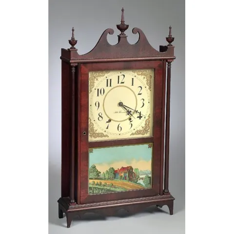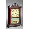 circa 1920. Mahogany case with 8 day time & strike brass works, transfer printed scenic reverse door glass, wood turned finials, fine original finish...