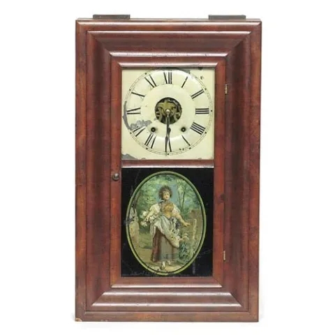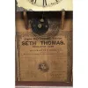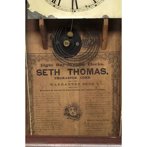 signed Seth Thomas, 8-day time and strike, weight-driven, brass works. Painted tin dial, Roman numerals. Mahogany case retains original paper label, ...