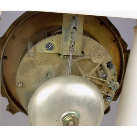 unmarked, except stamped numbers on time and strike, spring-driven, brass movement. Ornate clock with enamel dial, Roman numerals, cast gilt brass su...