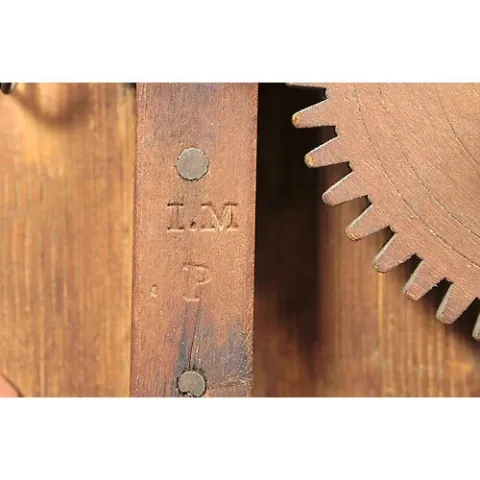 30-hour time and strike, weight-driven, CT-type wooden works. Painted wooden dial, Arabic numerals, spiral gilt center and scrollwork spandrels. Orig...