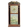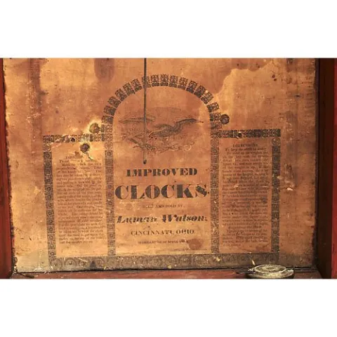 pine and poplar case with mahogany veneer at base. 30-hour time and strike, weight-driven, groaner-type wooden works. Painted Dayton, Ohio wooden dia...