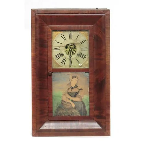 with 30-hour time and strike, weight-driven, brass works. Painted gilt dial, Roman numerals and decorated spandrels. Mahogany case and original paper...