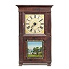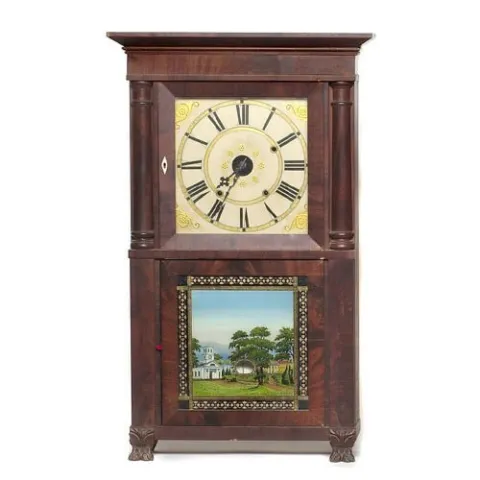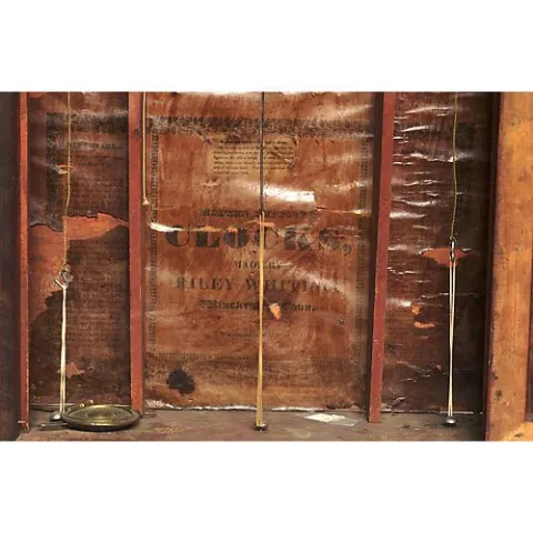 30-hour time, strike and alarm, weight-driven, wooden works. Painted wooden dial decorated with gilt feather and vintage central garter and scrollwor...