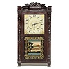 30-hour time and strike, weight-driven, wooden works. Painted wooden dial, Arabic numerals, gilt geometric and scrollwork center and spandrels. Mahog...