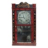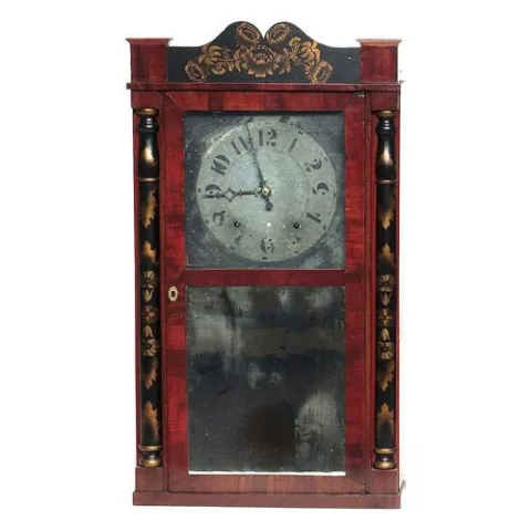 weight-driven, wooden works. Mahogany stenciled half columns and scroll-cut splat, flanked by plinths. Mirrored tablet, unusual painted zinc dial wit...