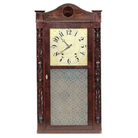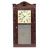 30-hour time and strike, weight-driven, wooden works. Painted wooden dial, Arabic numerals, gilt feather garter center and scrollwork spandrels. Maho...