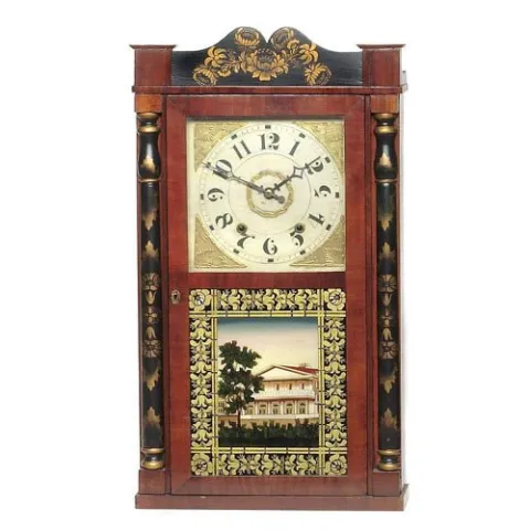 30-hour time and strike, weight-driven, wooden works. Painted Dayton, Ohio wooden dial with gilt work corners, and Arabic numerals. Mahogany, newly s...
