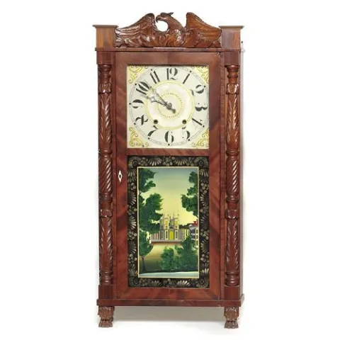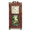 Farmington Ct. Shelf Clock, 8-day time and strike, weight-driven, wooden works. Painted wooden dial, Arabic numerals, gilt center garter and scrollwor...