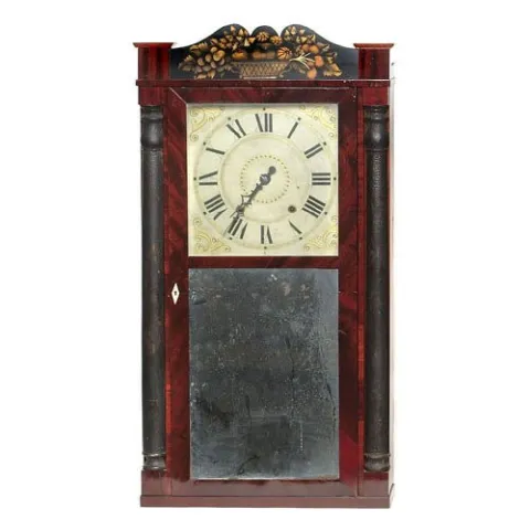 Williams & Co. Piqua Miami Co. Ohio Shelf Clock, 30-hour time and strike, weight-driven, wooden works. Painted wooden dial, Roman numerals, gilt cent...