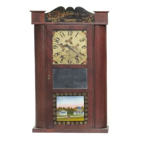 30-hour time and strike, weight-driven, wooden works. Painted wooden dial, Arabic numerals, and nice polychrome floral center and corners. Mahogany ca...