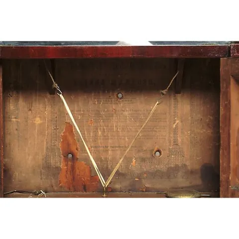 8-day time and strike, weight-driven, brass strap movement. Painted tin dial, Roman numerals, polychrome-painted roses in spandrels. Smoke-grained (b...