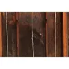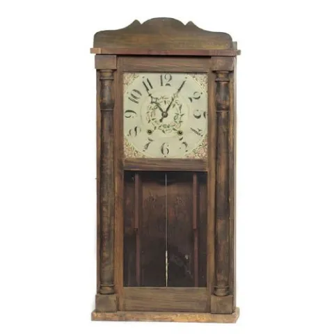 30-hour time and strike, weight-driven, CT-type wooden works. Painted wooden dial, Arabic numerals, polychrome floral garter center and floral scroll...