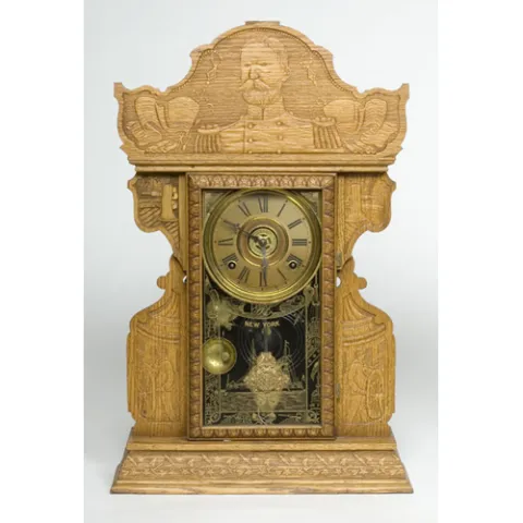 printed paper dial with Roman numerals, marked Welsh, pressed oak case with shoulder length uniformed portrait of Sampson, flanked by U.S. flags on s...