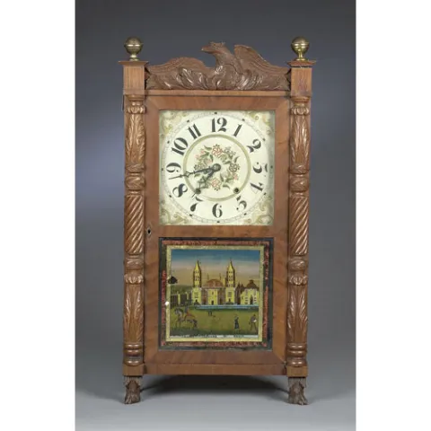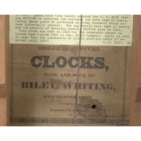 with a paper label reading, MODERN IMPROVED CLOCKS, MADE AND SOLD BY RILEY WHITING, WINCHESTER, CONNN. Warranted, if well used. Mahogany case with eag...