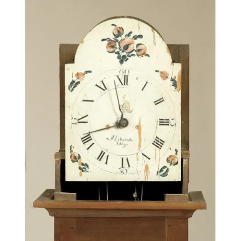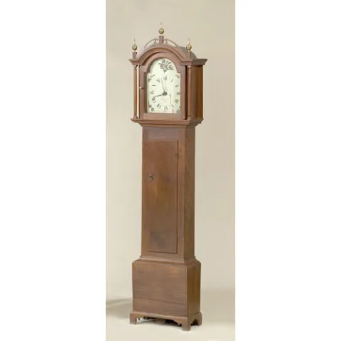 cherry with pine secondary wood. Hood has a pierced pediment with fluted plinths topped by brass finials, turned columns, and a tombstone door. Case h...