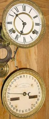C.1904, Ansonia Clock Co., Royal Bonn LA NORD, porcelain china clock in tu-tone sky blue and white with magenta colored rose bottom center, plus gold highlights, the porcelain dial with open escapement.