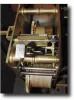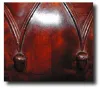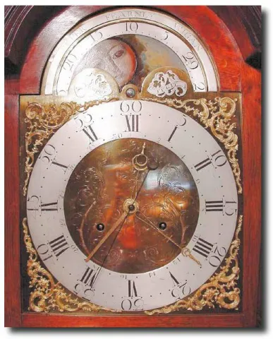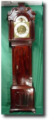 George III impressive flame mahogany Moonroller longcase clock, circa 1790 Large English George III impressive flame mahogany Moonroller longcase, with fan shell satinwood inlay, cross and feather banding in a Gothic case. Blind fretwork to case. Reeded Corinthian columns with matching reeded Corinthian columns to hood. Surmounted by two plaster roses. 14" brass dial movement with inside date hand and central seconds hand. Deadbeat escapement. Painted moonroller in break arch. Engraved plague "Peter Fearnley of Wigan Tempest Fugit". Circa 1790. 100" x 18" x 9" Additional keywords: longcase, tallcase, grandfather