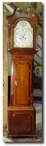 Oak case with mahogany cross banding and boxwood stringing, swan neck pediment to the hood. Charming painted arch dial in classic 'Adam' style. The paterae to the swan necks are particularly interesting being sphinx.....all things 'Egyptian' were high fashion following Nelson's defeat of the French at the battle of the Nile in 1791. The case has a lovely rich colour and patina, reeded canted corners typical of the case designs in this area. Long Georgian door. The 8 day movement strikes the hours on a bell and there are subsidiary seconds and date dials. Movement has been recently cleaned and is running. This very original clock has had little necessary work carried out. In common with most country clocks the feet have been replaced because of the effects of damp, similarly the bottom quarter of the back board. The case has been treated for woodworm. Edward Bell is listed in 'Watchmakers and Clockmakers of the World' Vol 1 by G. H. Baillie, as working ca.1795 and I would place this clock circa 1792 - 95. (Note: shipping to United States approx. $550). Additional keywords: longcase, grandfather, English