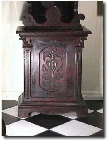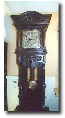 This is a nicely carved art nouveau tall clock. It has a large high quality 8 day gong strike movement. The clock has copper , brass , and silver tri-...