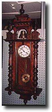 Walnut half columns with burled veneer. Engraved bob; porcelain dial; turned half columns and finials. Maker: Philipp Hass, St. Georgen. The large bel...