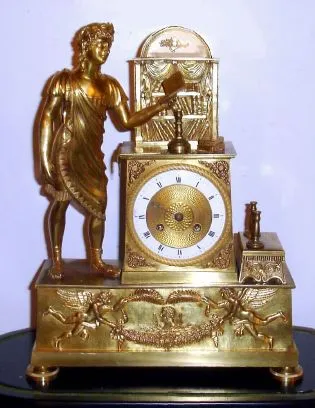 Gilt cast brass case with most of the fire gilding polished off. There are three tiny turned brass candle sticks with this clock that are covering up ...