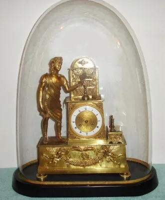 French, 8-day time/strike figural mantel clock, Student in Library, with old repaired dome, on wooden base. Circa 1830.