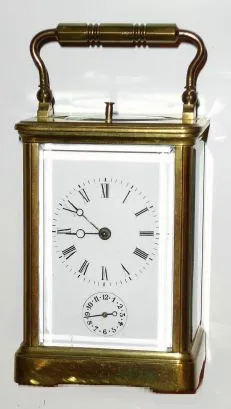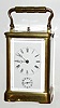 French, Brass cased carriage clock, time, strike, alarm and repeat, in a plain Corniche case, with original travel case which has losses, C.1900.