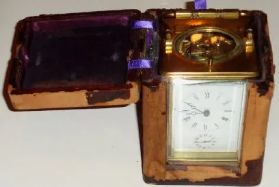 beveled glass is all good; original hands, but minute hand is loose and may fall off in shipment. Original silvered lever platform is intact. Balance ...