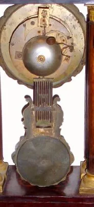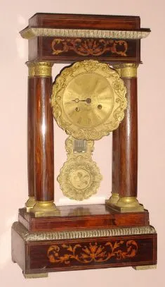 French, 4-Column Empire Portico clock, rosewood with inlaid floral design, 8-day, bell strike, C.1880.