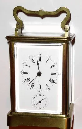 French, Brass cased carriage clock, time, strike and alarm, in a simple Corniche case, and with original lever platform intact. C.1900