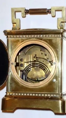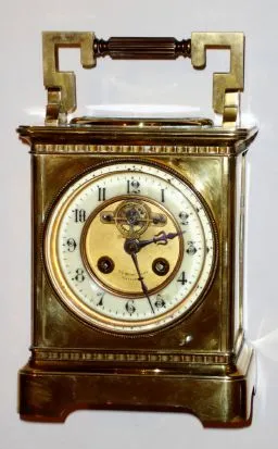 French, Oversize carriage clock, with fancy platform/lever on the dial below 12. Also with compass and thermometer set into the top of the case, showing both Fahrenheit and Reumer scales, striking on a gong, retailed by the White House in San Francisco, C