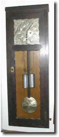 Case: Art Deco oak veneer on pine, 33 " high Works: 8 day weight driven time and strike on chime rod. Hand tooled "COIN SILVER" dial plate and pendulu...