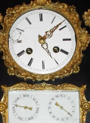 French, ormolu and slate double dial calendar clock, the dials set into a piece of ebonized walnut, and the sides of black slate, silk thread suspension, showing date and day of the week (in abbreviated French) C.1850