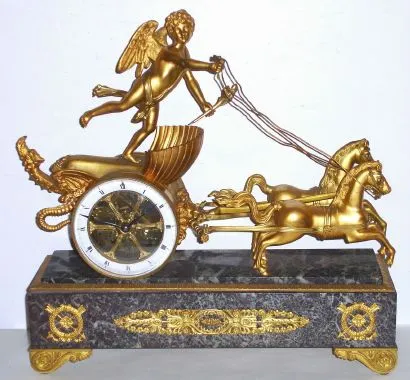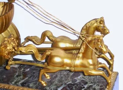 French, Fabrique D'Horologerie, Paris, Amor standing in his charriot, at the reins of a pair of charging horses, a fine French figural clock in a design that was popular for over 2 centuries. 8-day time and bell strike, No. 2508. C.1880.