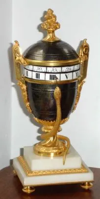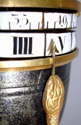 French, Urn shaped annular dial timepiece, with brightly gilded serpent and accents against a brass urn and lid, the dials with individual porcelain numerals, Roman for hours and Arabic for minutes, C.1890