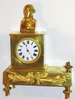 French, C.1820, a small figural clock bearing bust of G. Washington, with a crown-verge, fusee movement, wound from the rear