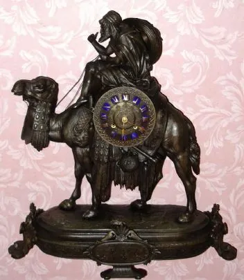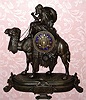 French figural white metal mantel clock, Arabic motif depicting Bedouin mounted on camel. Dial has applied gilt Roman numerals on blue enamel plaques and base has plaque with Arabic inscription, time and strike on bell 8 day spring driven mvt. C. 1870.