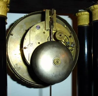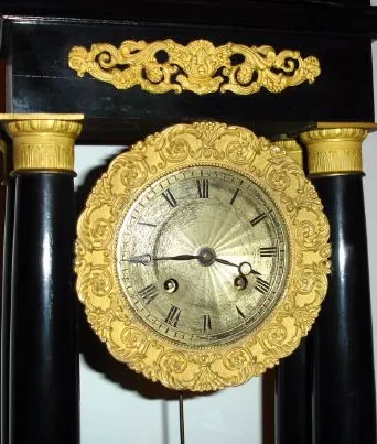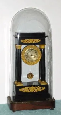 French, Empire-style black ebonized four column case with gilt ormolu surrounds and trim, spring driven brass mvt, excellent dome measures 24 1/2"H x 11"L x 7"W, clock measures 18"H. C. 1860.