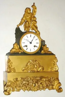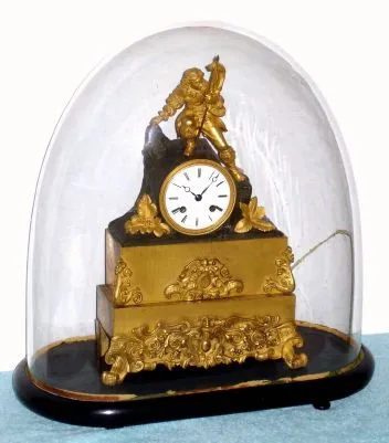 French, bronze and fire gilt figural mantel clock, 8-day time and bell strike, Young Explorer with Flag, and with cracked dome that Len had over it to keep it clean. C.1850.