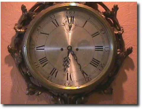 Gilt Wood Carved Cartel Wall Clock, Circa 1800 This is an early English double fusee gilt wood cartel clock. The 12" enamel dial has Roman numeral hour markers and Arabic 5 minutes markers. The clock has a rise and fall indicator, a large rectangular double fusee movement with an anchor escapement and strikes on a large heavy coil gong. The carved wood case retains much of its original water gilding. The floral leaf and pierced scroll work design has had few repairs over the years and is in great condition. English giltwood cartel clocks are one of the rarest and most desirable of English wall clocks found. The dimensions of this clock are 29 " x 21.5 " 6 ". Running duration 8 Days
