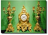 A substantially large fine quality gilt-bronze 3 piece clock set (garniture). The gilt-bronze elaborately cast case with matching candelabra. The 8-day movement chiming hours and half hours on a bell with count wheel striking. white convex enamel dial with royal blue roman numerals and finely pierced gilt hands, 23" x 10" x 6"