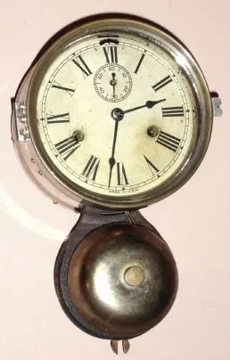 Seth Thomas Clock Co., 30-hour time and ship's bell strike wall clock, outside bell, Circa 1884