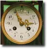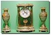 Green onyx and gilt-brass mounted four glass mantel clock, circa 1890. A gilt-brass mounted green onyx striking four glass mantel clock and garnature, the oval case with moulded top and base on bun feet, the lanceolate leaf bezal containing a white enamel dial with Arabic numerals decorated with painted floral swags, pierced gilt-metal hands, the French twin train movement with hour and half hour strike on a gong and a decorative sunburst pendulum 12" x 8" x 7"