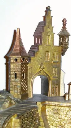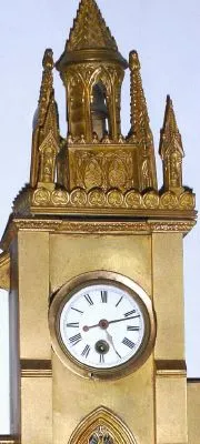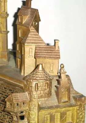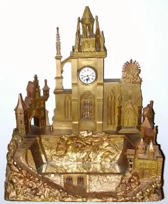 Mid 19th Century, French or Swiss, Clock in the form of a Cathedral complex, a mirrored pond in front of the church, formerly with music box, now absent.