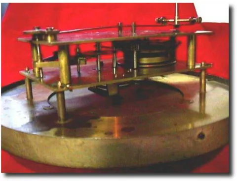 This 8 day clock has an unusual high style, art deco, walnut case with six beveled glass panes. The beveled glass dial has gilt painted spandrels on the reverse side of glass to accent the dial. The dial is bronze and silver with Arabic hour numbers. The brass movement has an adjustable escapement and strikes a single large chime rod. The clock has an engraved brass beat indicator inside the bottom of the case. The movement is running but needs a good cleaning. Serial number is 475912. The dimensions of this clock are 34 " x 13.5 " x 5 ". Running duration 8 Days